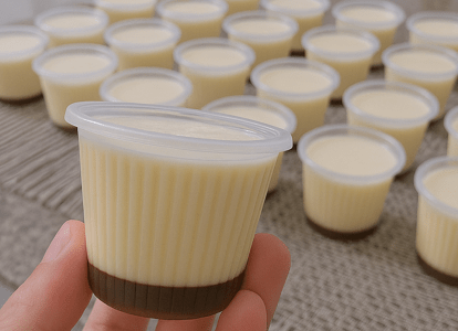 Coloque uma pequena porção da calda no fundo de cada copinho e, em seguida, adicione o pudim batido. - Leve à geladeira: