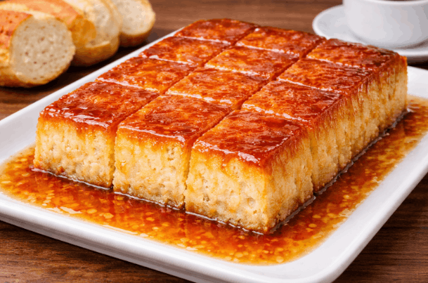 Espalhe no fundo da forma e reserve. - Pique os pães e coloque de molho no leite por 5 minutos. Bata no liquidificador com os ovos e o leite condensado (ou açúcar). Despeje sobre a forma caramelizada. Leve ao forno a 180°C por cerca de 40 a 50 minutos. Faça o teste do palito: se sair limpo, está pronto. Espere amornar e desenforme.