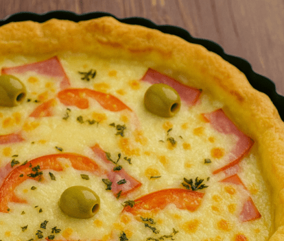 Monte o recheio: Em uma tigela, misture presunto, muçarela, tomate, cebola, requeijão e os temperos. Espalhe o recheio sobre a massa pré-assada. Decore com azeitonas e finalize com orégano. Leve ao forno por mais 20–25 minutos, até o topo gratinar e o recheio borbulhar. Sirva morno com salada ou puro mesmo – sucesso garantido.