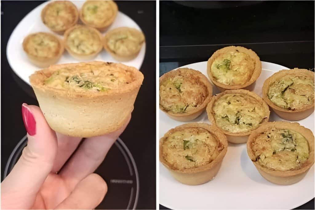 - Retire as forminhas da geladeira e cubra o fundo de cada uma delas com o alho poró refogado.
