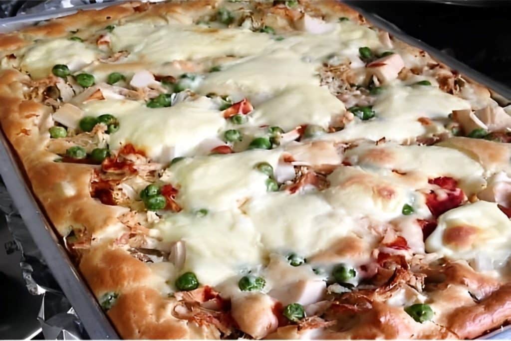 - Disponha sobre a massa: o frango refogado, o palmito, a ervilha fresca e o molho de tomate.
